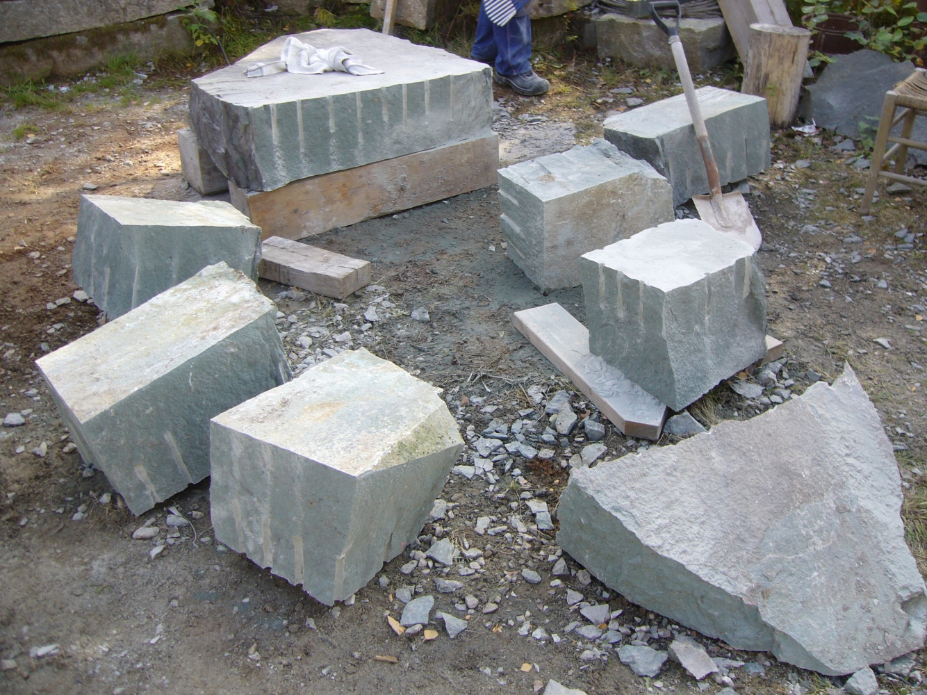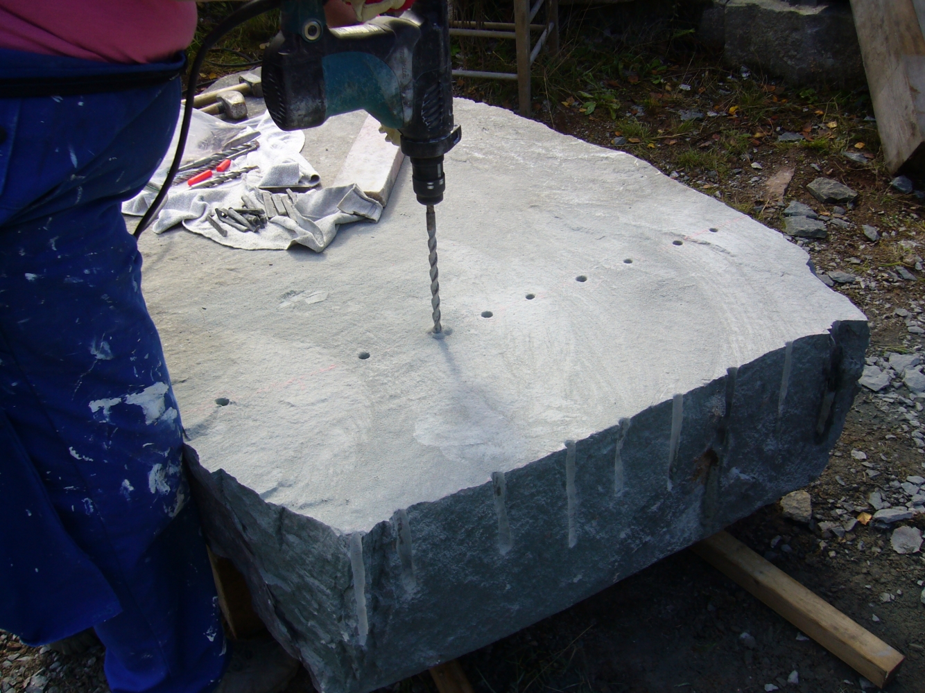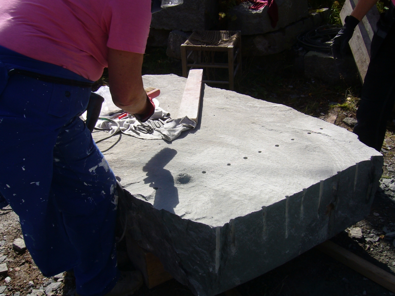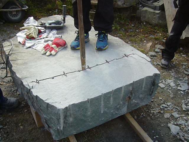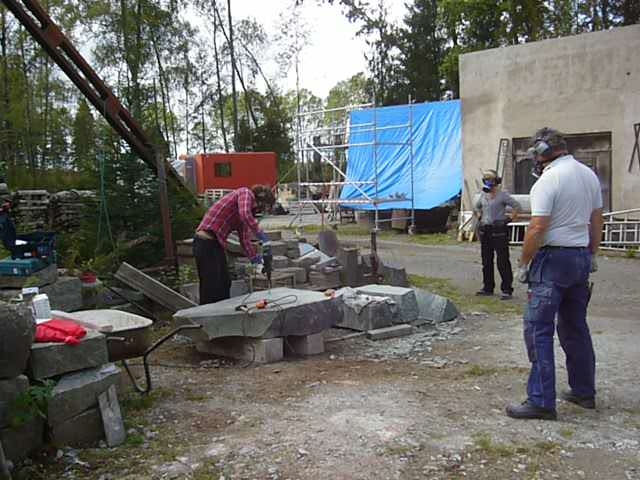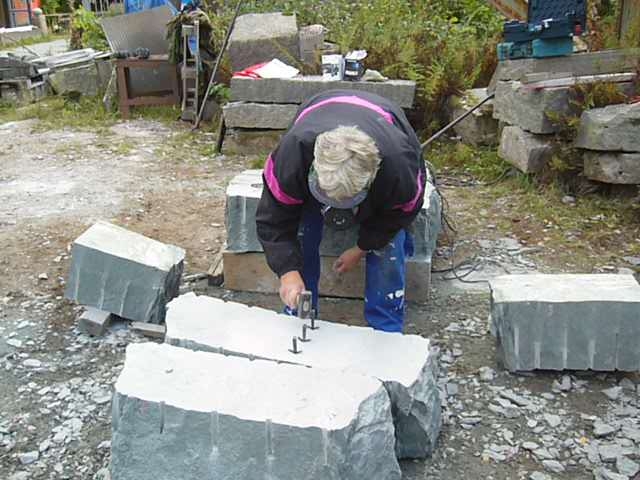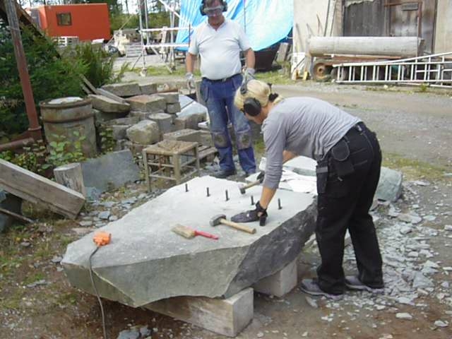 Innan vi kan börja jobba i sten måste vi se till att vi har rätt material. Sten är naturmaterial och hämtas ur berg i stora block. Den ska delas till rätt mått. Här ser du hur deltagare av stenhantverks utbildning gör precis detta.
