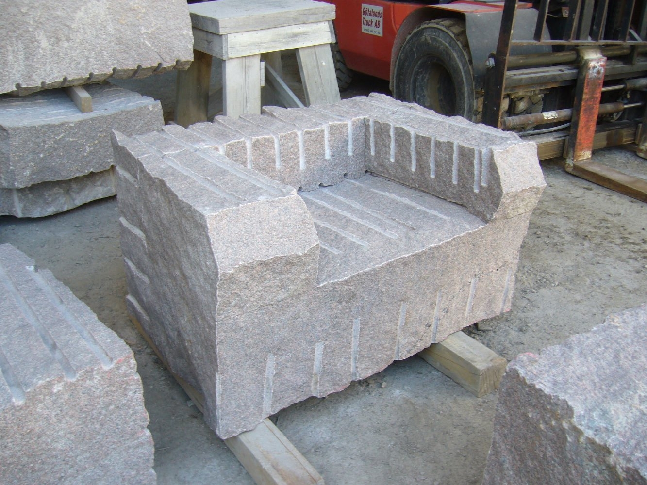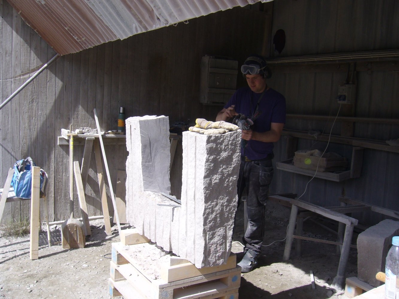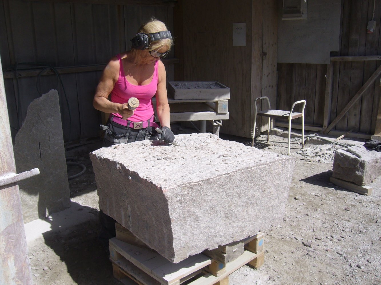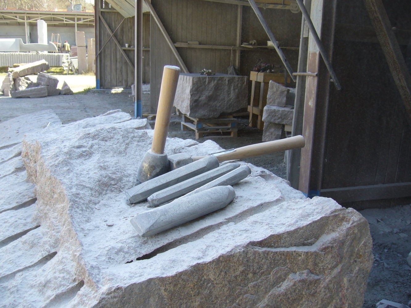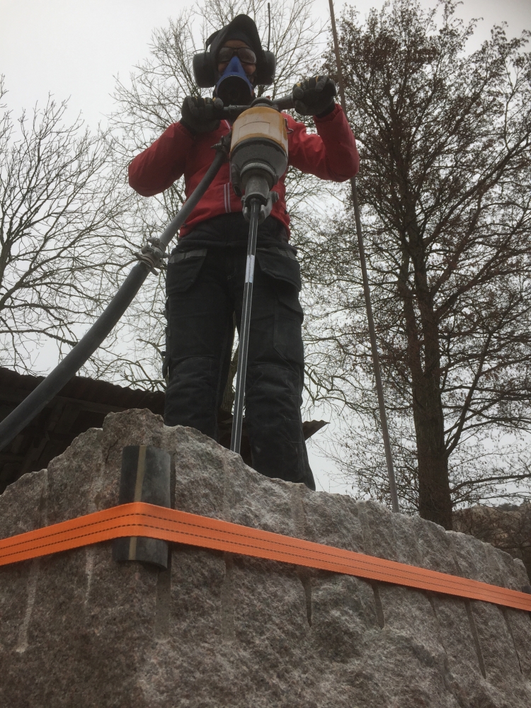 Efter att stenarna för projekt ‘kvarnsten’ fraktades till arbetsplatsen börjar deltagare med delningen. Sedan startades tillverkningen av de olika delar. Det blir som en möbelgrupp i granit, och varje soffa och soffbord ser annorlunda ut.