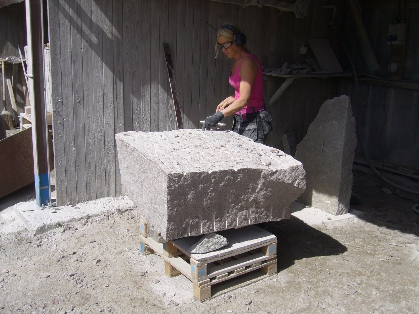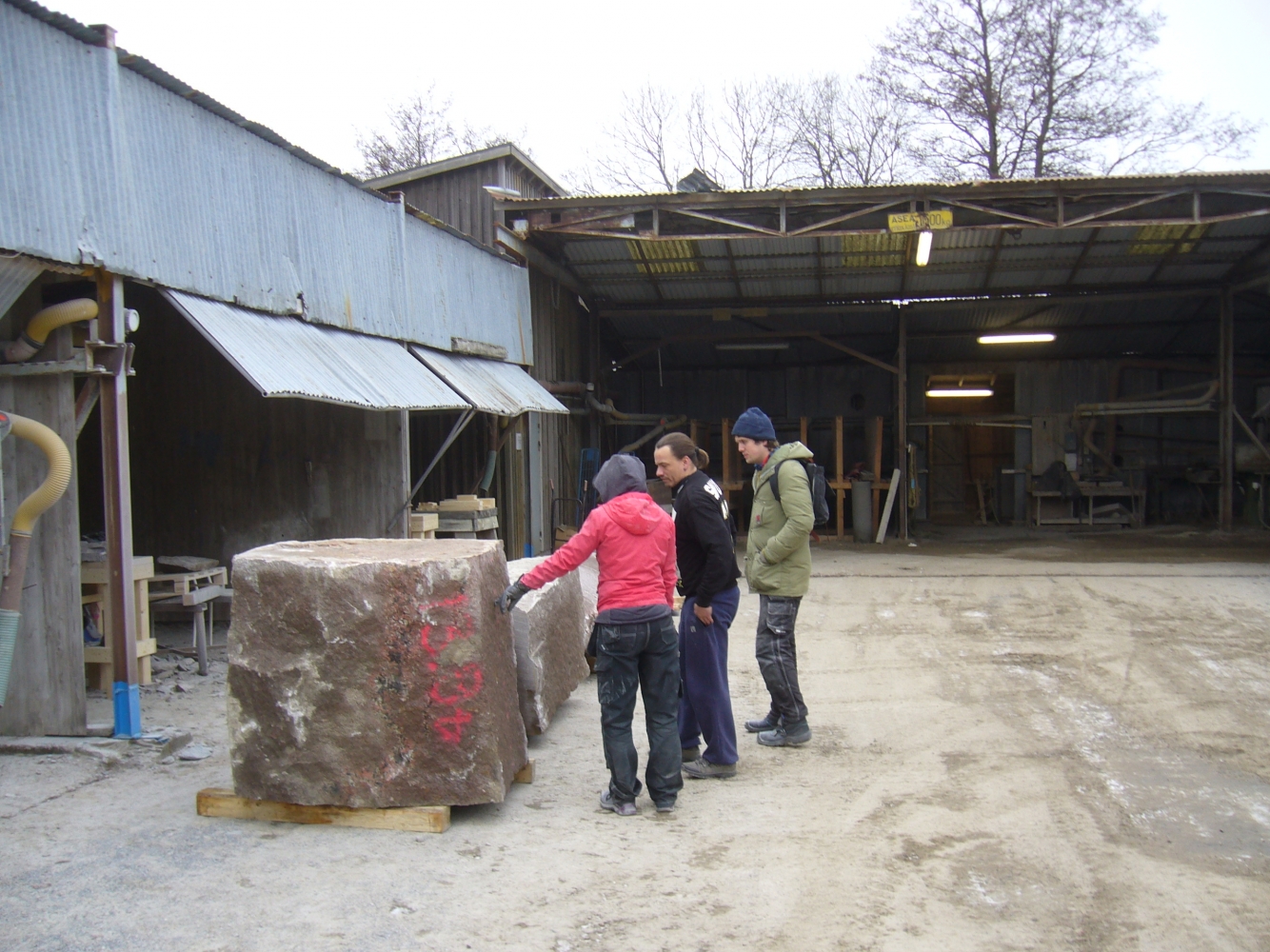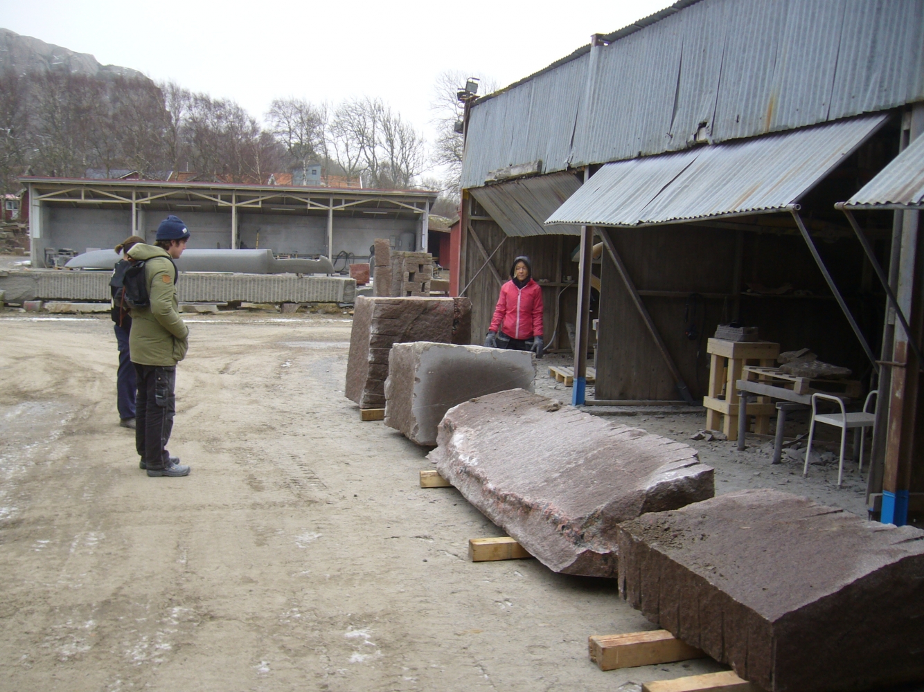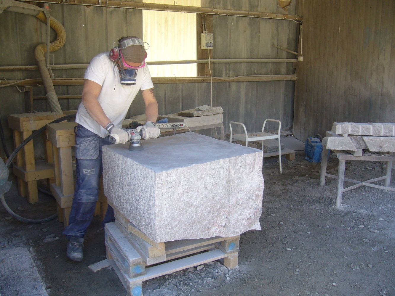 Efter att stenarna för projekt ‘kvarnsten’ fraktades till arbetsplatsen börjar deltagare med delningen. Sedan startades tillverkningen av de olika delar. Det blir som en möbelgrupp i granit, och varje soffa och soffbord ser annorlunda ut.