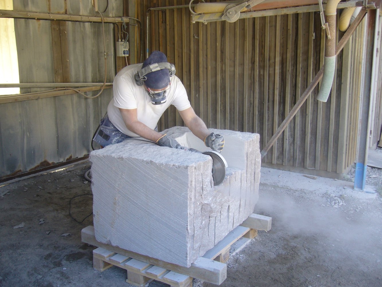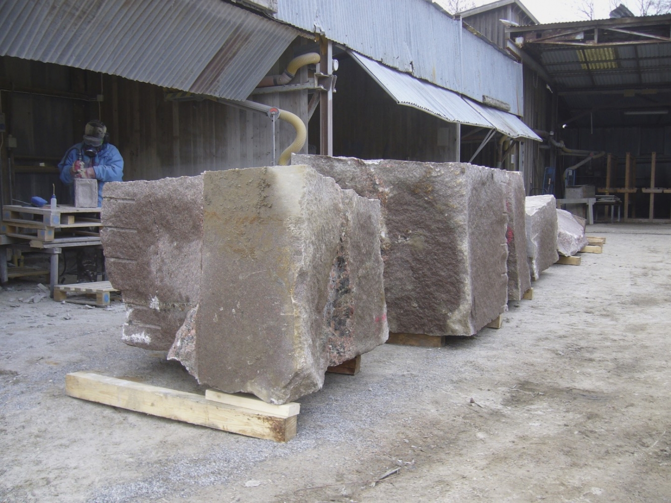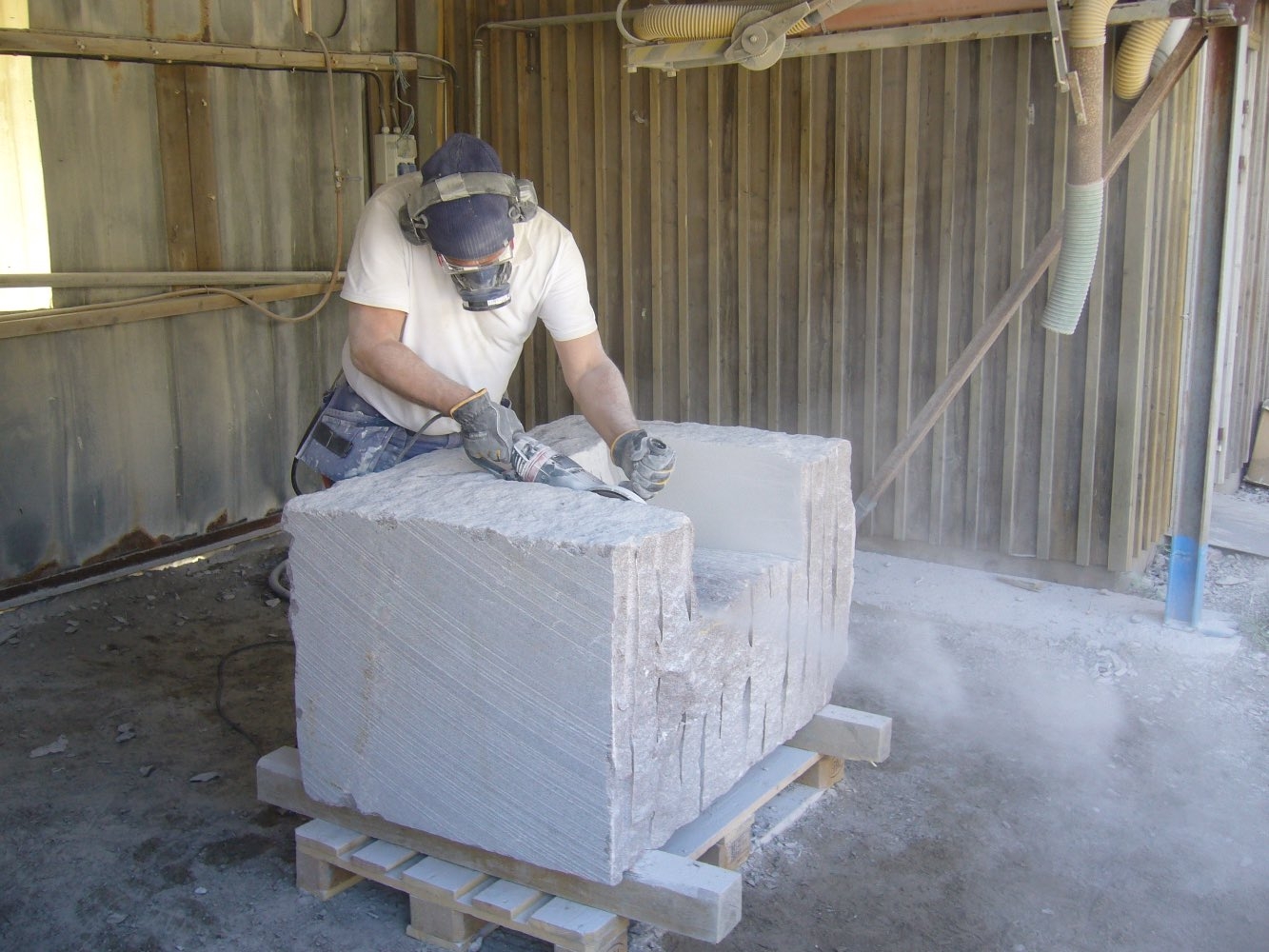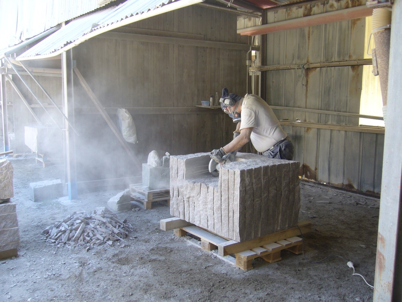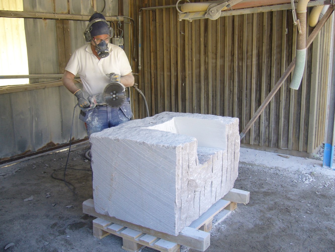 Efter att stenarna för projekt ‘kvarnsten’ fraktades till arbetsplatsen börjar deltagare med delningen. Sedan startades tillverkningen av de olika delar. Det blir som en möbelgrupp i granit, och varje soffa och soffbord ser annorlunda ut.