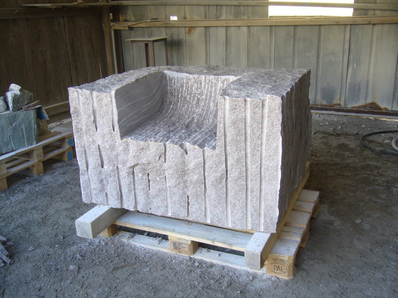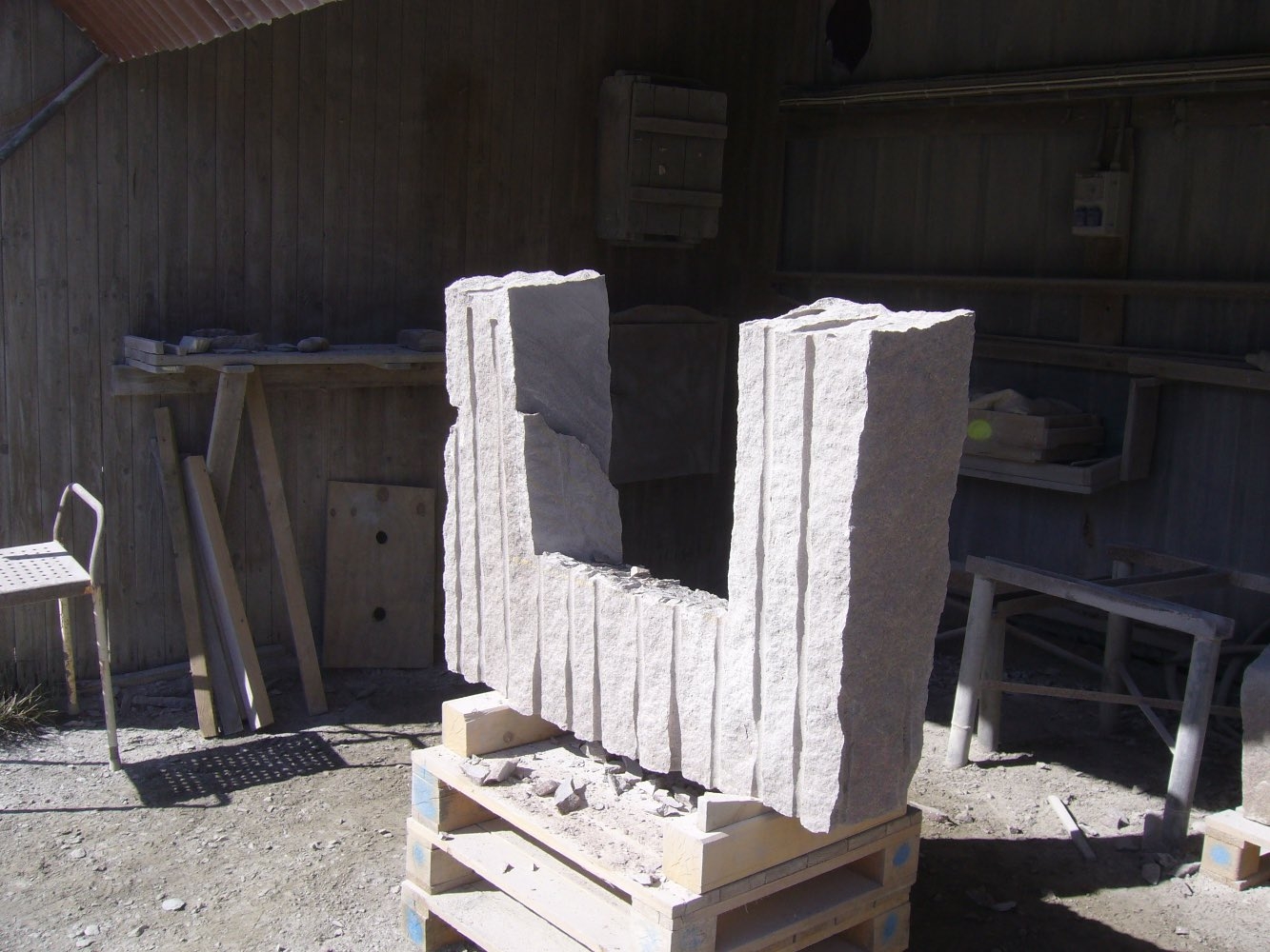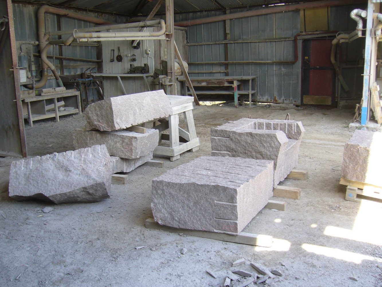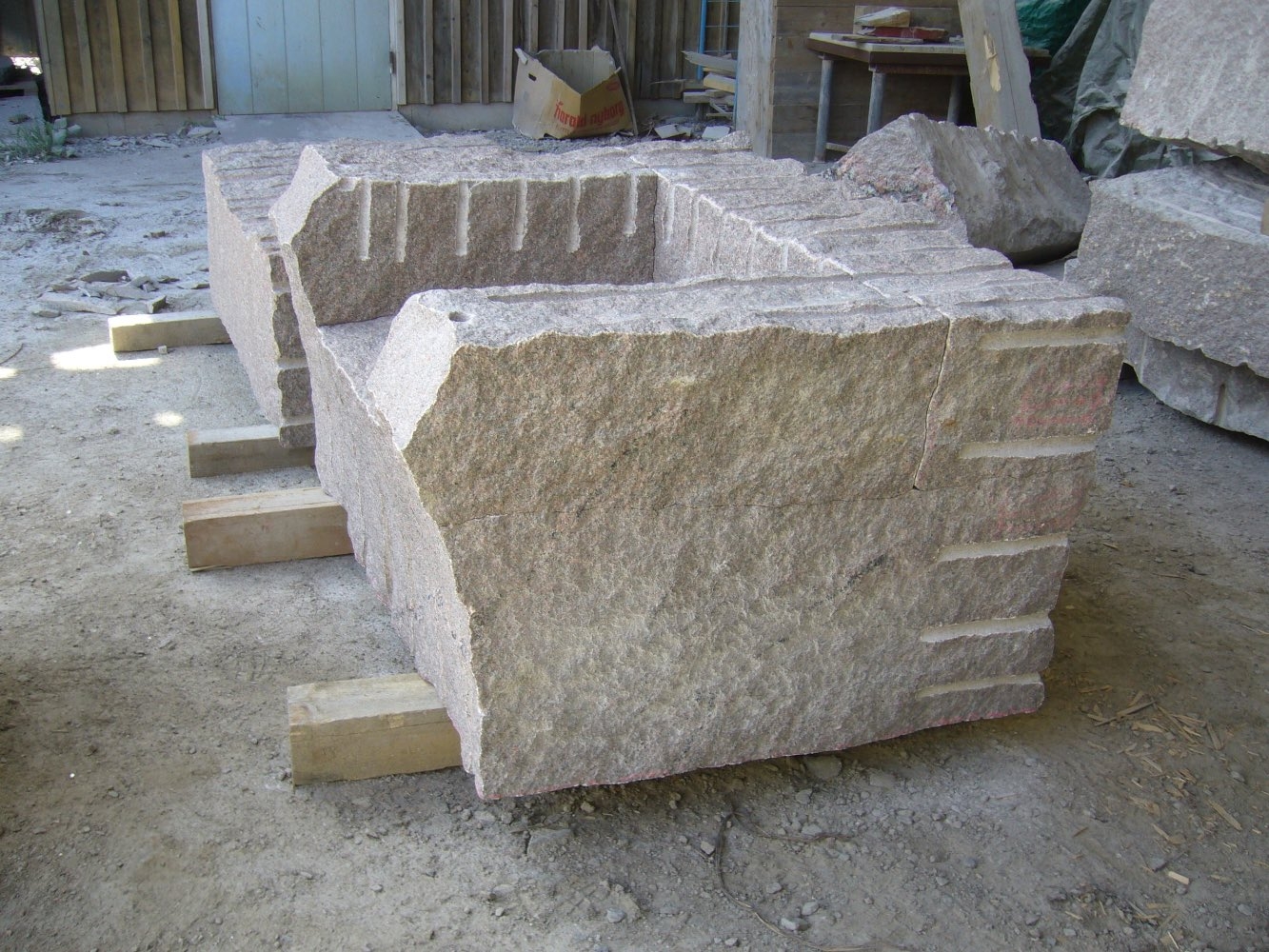 Efter att stenarna för projekt ‘kvarnsten’ fraktades till arbetsplatsen börjar deltagare med delningen. Sedan startades tillverkningen av de olika delar. Det blir som en möbelgrupp i granit, och varje soffa och soffbord ser annorlunda ut.