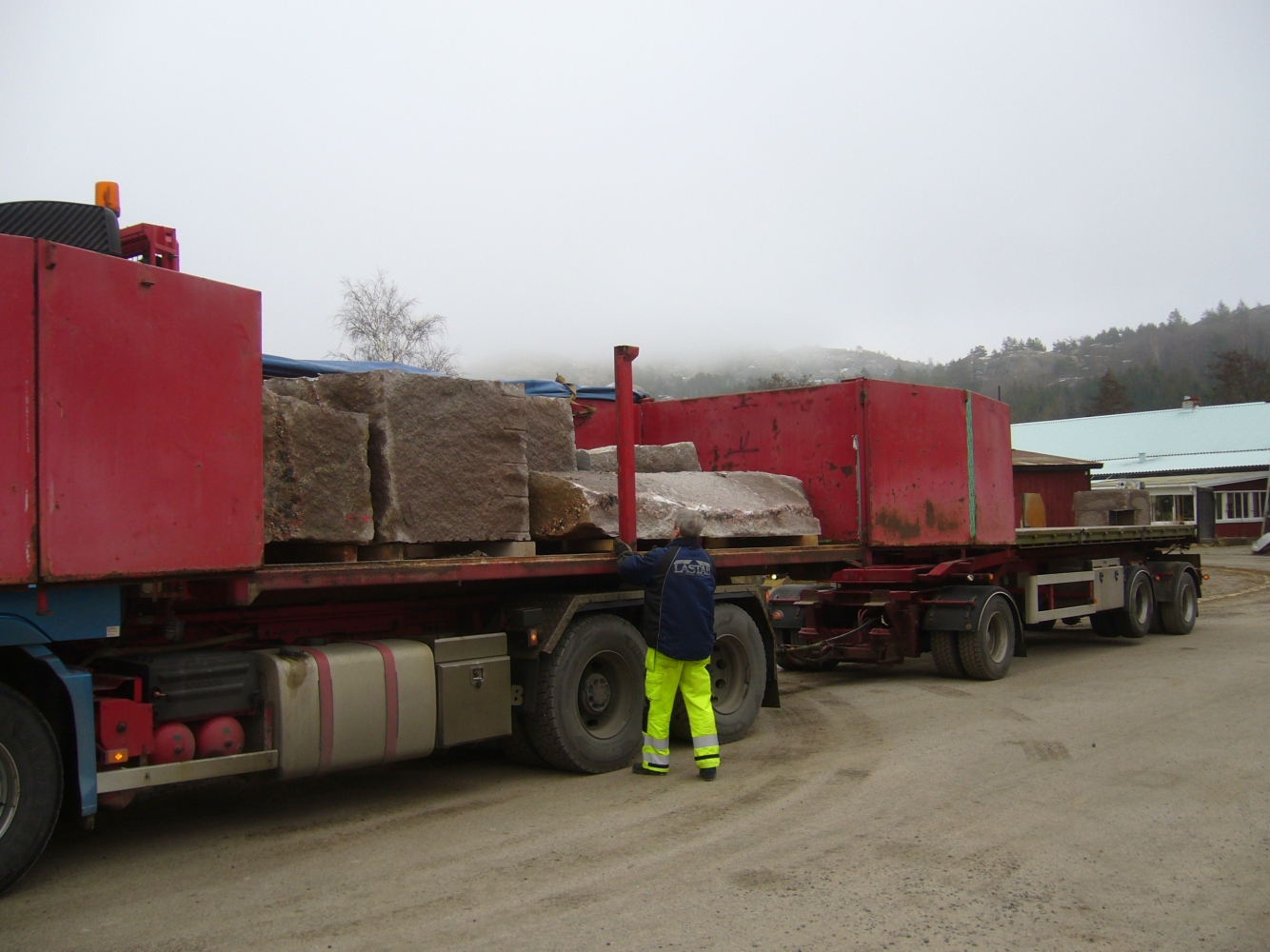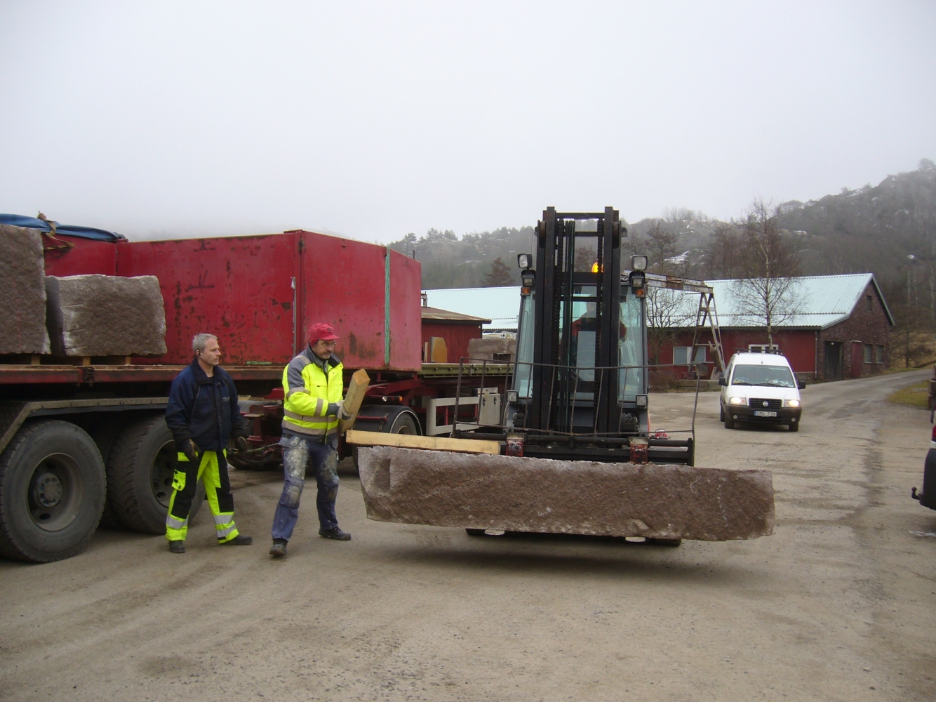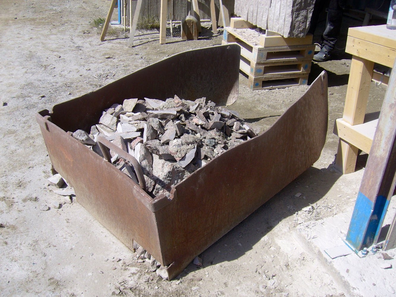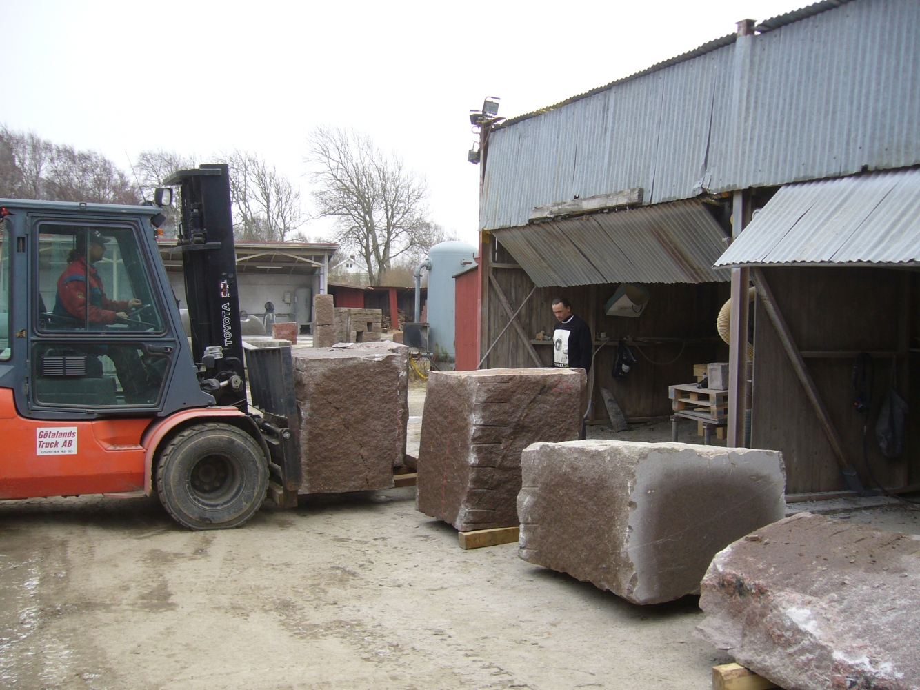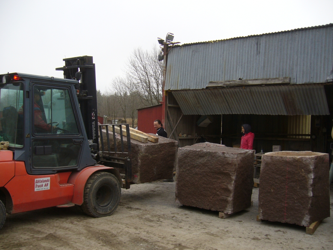 Efter att stenarna för projekt ‘kvarnsten’ fraktades till arbetsplatsen börjar deltagare med delningen. Sedan startades tillverkningen av de olika delar. Det blir som en möbelgrupp i granit, och varje soffa och soffbord ser annorlunda ut.